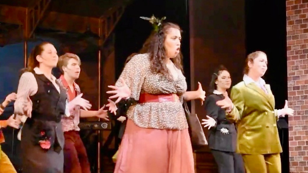 In the other, intertwined storyline of Hadestown, the story of Persephone & Hades, I loved Sophie Ajlouny’s performance entering the stage with beaming confidence and attitude. She worked the audience’s first row in „Our Lady of the Underground“ that opens the second act like a confident old soul in the body of a High Schooler. Brilliant! Kai Kaushik plays Hades with wonderful understated elegance and sunglass-enhanced mystique. Great voice and acting! The highlight for the Hades character always is „Why we build the wall.“ Kai leads it with confidence and the directing team used the full cast to create a chilling scenery surrounding the audience from three sides. Music, singing and setting of the scene definitely gave me goosebumps.